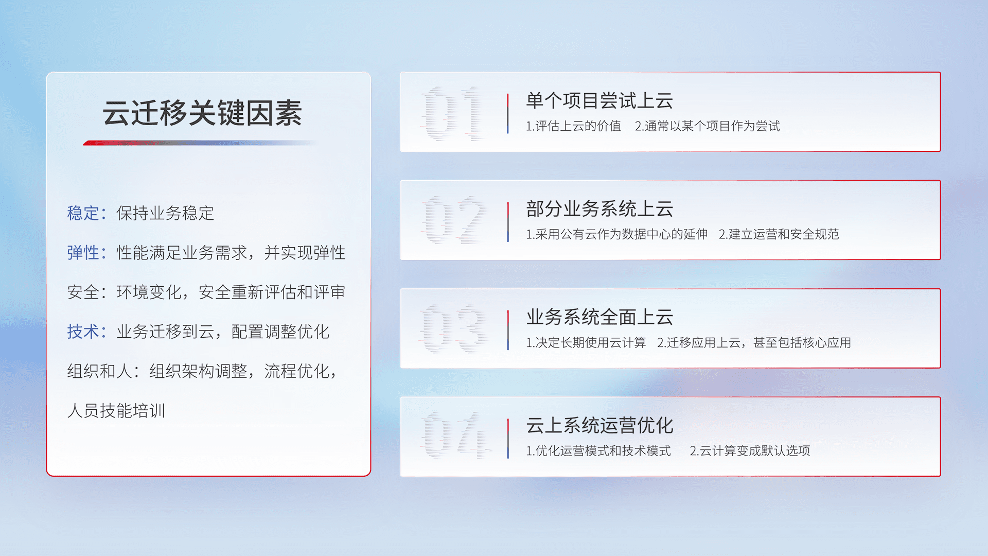 结合实际业务,,从规划设计、、云平台选型、、云原生改造、、数据迁移、、集成交付,,,迁移全过程为客户识别最佳上云路径,,,,做好风险识别管理,,,设计网络架构、、、、身份权限、、、安全审计合规、、、、操作审计、、、、日志审计、、监控告警策略、、多站点容灾设计等,,,,对云上基础设施进行整体规划,,,,提升IT治理水平,,,,以满足弹性、、高可用、、、、高性能的需求。。